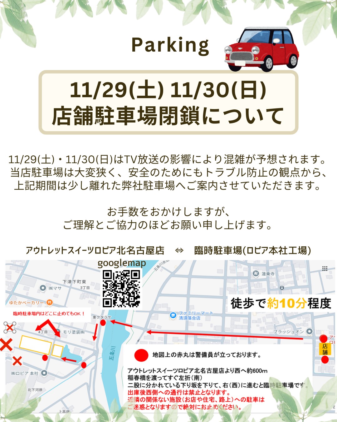 お客様の安全確保とトラブル防止のため、 誠に勝手ながら、上記期間中は店舗駐車場を閉鎖し、近隣に臨時駐車場をご用意させていただきます。