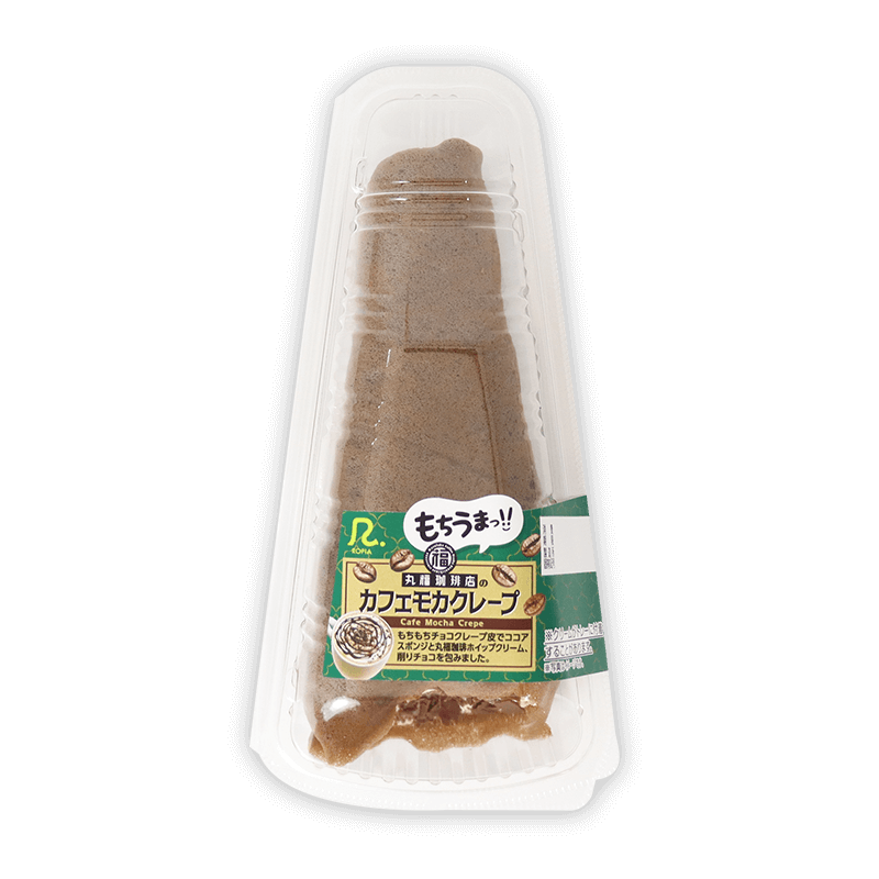 もちもち食感のココアクレープ皮で、丸福珈琲ホイップクリームとココアスポンジ、削りチョコを包みました。