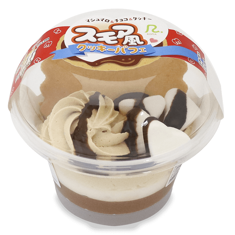 ココアムースとミルクムースに、甘みのあるキャラメルホイップクリームを絞り、自社焼成の全粒粉入りクッキーと、チョコソースをかけたマシュマロをトッピングしました。