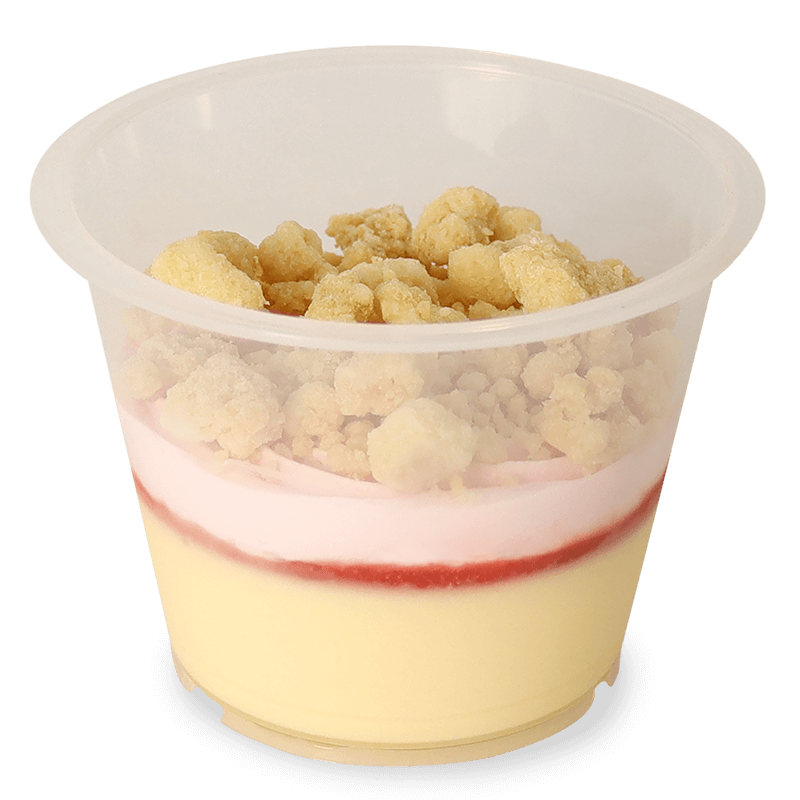 北海道クリームチーズを使用したねっとり食感のチーズケーキに、甘酸っぱい苺ソースと苺ホイップクリームを絞り、クランブルをごろっとトッピングしました。