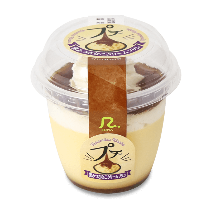 昔ながらの卵プリンに、きなこホイップクリームを絞り、黒みつソース、小豆かのこをトッピングしました。